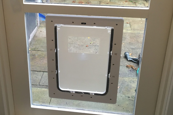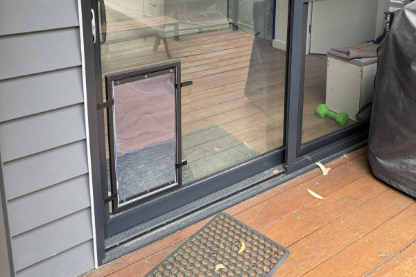 - For glass doors – These doors can fit on single or double-glazed glass and the majority of sliding doors. They are available in a variety of sizes, and sit flush with your glass door. This is a great option if you have a sliding glass door leading to an enclosed area like a backyard. Glass doors are also one of the simplest locations for installation, depending on your glass type. For example, single-glaze can be cut and installed within just one day. However, choosing to install through toughened, or double-glazed glass can be more complex. This often requires the entire panel to be replaced with a new, pre-cut unit for your pet-door, which may require a return visit. Glass is also a fragile material, and you must choose a professional to install through the existing glass safely.
